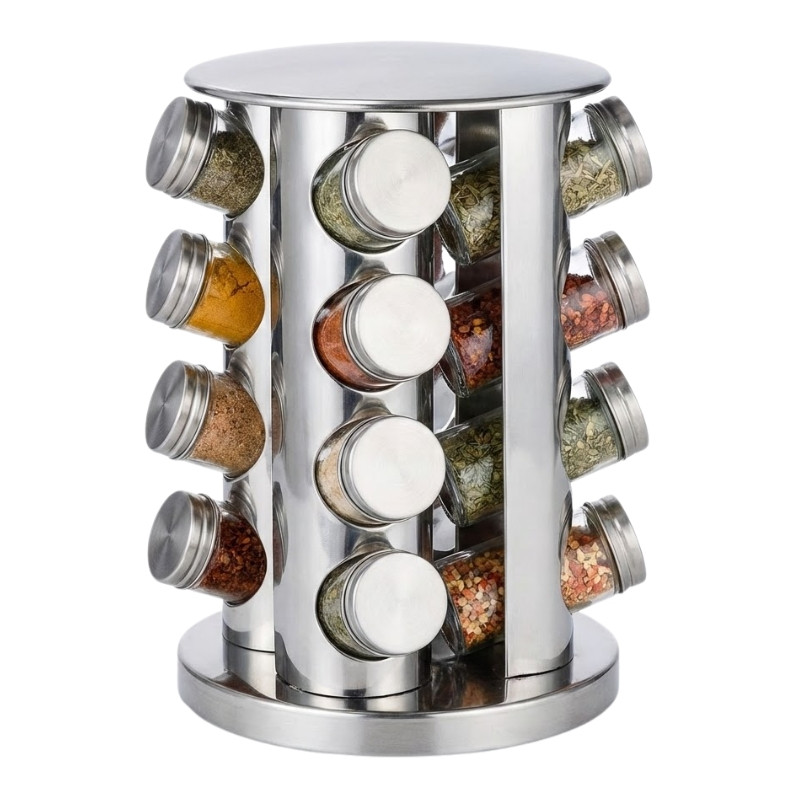 Praktikus és elegáns megoldás a konyhai fűszerek rendszerezésére. A 16 darabos, forgatható fűszertartó állvány helytakarékos kialakításának köszönhetően könnyen elfér a konyhapulton, miközben minden szükséges fűszer kéznél van.