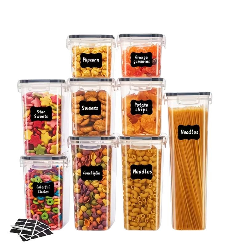 Nagy kapacitású, légmentesen záródó tárolókészlet konyhai alapanyagok rendszerezéséhez. Ideális gabonák, rizs, tészta, fűszerek, kávébab és egyéb szárazáruk higiénikus, átlátható tárolására.