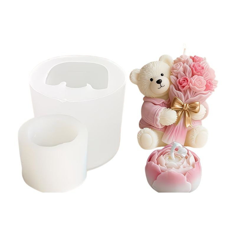 2 db-os 3D Szilikon Öntőforma Szett - Rózsás Maci és Rózsafej - Gyertya és Szappankészítéshez LU13051716