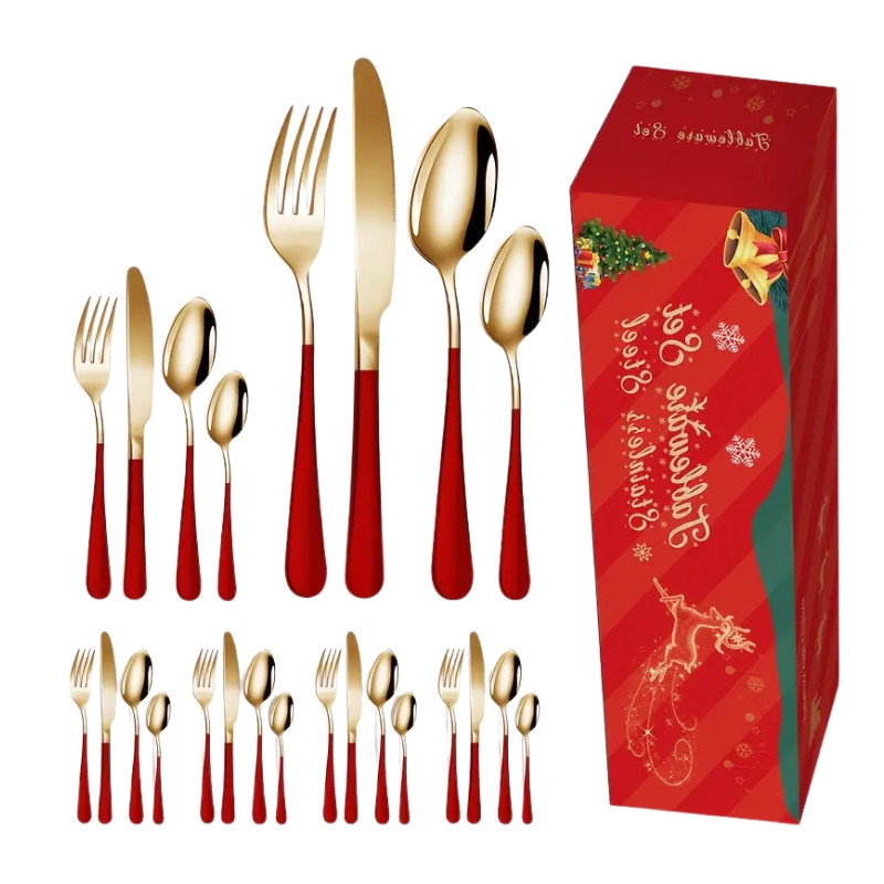 Elegáns és modern evőeszközkészlet, amely ideális választás ünnepi vacsorákhoz, családi összejövetelekhez vagy különleges alkalmakhoz. A piros-arany színkombináció és a karácsonyi díszdoboz tökéletes ajándékká is teszi.