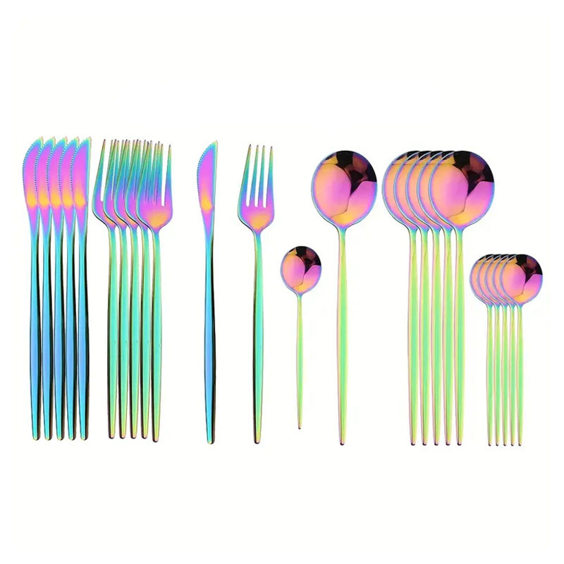 Ez a 24 részes evőeszköz készlet rozsdamentes acélból készült, szivárvány színű, modern dizájnban, amely egyedi és figyelemfelkeltő megjelenést biztosít az étkezésekhez. A készlet ideális választás bármilyen étkezési alkalomra, legyen szó hétköznapi étkezésről vagy ünnepi vacsoráról, és tökéletes kiegészítője minden modern konyhának.