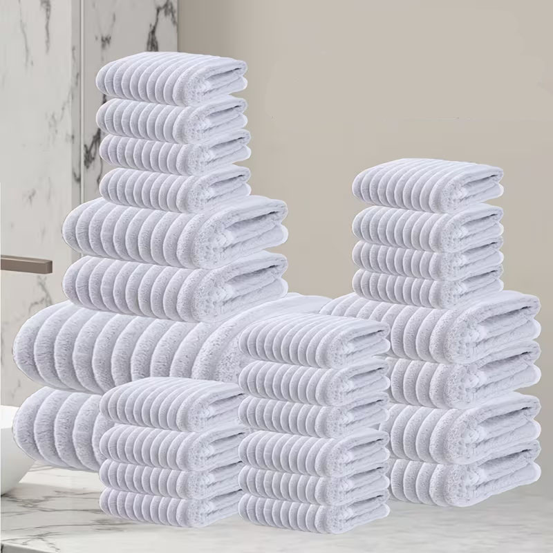 Törölközőtípusok / méretek: A szett valószínűleg többféle méretet tartalmaz — például fürdőtörölközőket, kéztörlőket, mosdó‑ vagy arc‑ törölközőket, így szinte minden igényt lefed: zuhanyzáshoz, fürdéshez, kéz / arc törléshez, sőt akár edzőtermi vagy strand használathoz is.