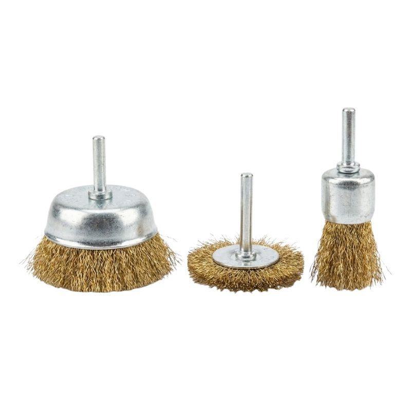 Háromrészes drótkefe készlet fúrógépbe fogható szárral. Ideális fémfelületek tisztítására, rozsdaeltávolításra, festéklemarásra és hegesztési varratok tisztítására nehezen hozzáférhető helyeken is.