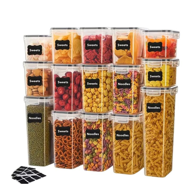 Nagy kapacitású, légmentesen záródó tárolókészlet konyhai alapanyagok rendszerezéséhez. Ideális gabonák, rizs, tészta, fűszerek, kávébab és egyéb szárazáruk higiénikus, átlátható tárolására.