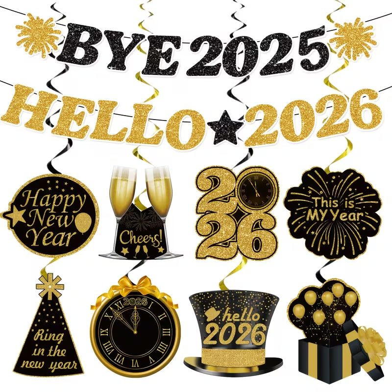 Búcsúztassa 2025-öt és köszöntse 2026-ot stílusosan ezzel a 35 darabos, csillogó parti dekorációs készlettel. A csomag elegáns fekete és arany színekben pompázik, és mindent tartalmaz, amire szüksége van a tökéletes szilveszteri hangulat megteremtéséhez. A szett központi elemei a "BYE 2025" és "HELLO 2026" zászlófüzérek, valamint a látványos, lógó spirál dekorációk, amelyek fekete-arany motívumokkal (pl. óra, pezsgő, "Happy New Year") vannak díszítve.