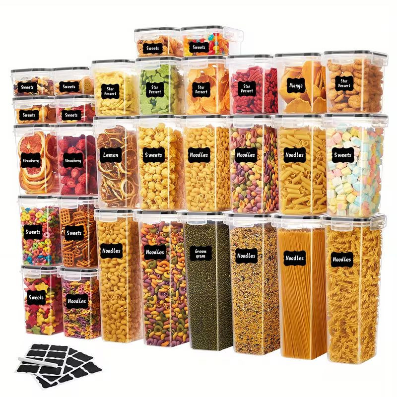 Nagy kapacitású, légmentesen záródó tárolókészlet konyhai alapanyagok rendszerezéséhez. Ideális gabonák, rizs, tészta, fűszerek, kávébab és egyéb szárazáruk higiénikus, átlátható tárolására.
