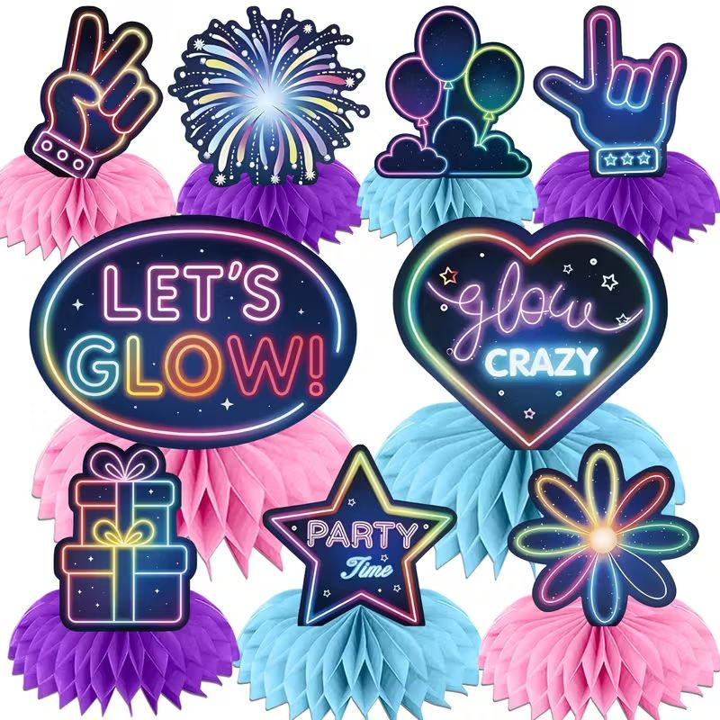 Dobja fel a bulit ezzel a 9 darabos, vibráló színű asztaldísz készlettel! A szett "Glow Party" témájú, látványos, neoncsöveket imitáló dizájnnal készült (mint pl. "LET'S GLOW!", "Glow Crazy", tűzijáték, ajándékdoboz), élénk rózsaszín, kék és lila méhsejt talpakkal. Tökéletes választás világítós témájú (Glow) partikhoz, születésnapokhoz vagy bármilyen táncos eseményhez.