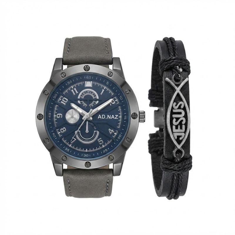 Ez a különleges AD.NAZ ajándékszett a férfias, indusztriális stílust ötvözi a spiritualitással. A csomagban egy robusztus megjelenésű karóra és egy egyedi, fonott karkötő található, amely a hitet szimbolizálja. Ez a párosítás tökéletes választás azoknak a férfiaknak, akik büszkén vállalják értékeiket, miközben szeretik a markáns, divatos kiegészítőket.