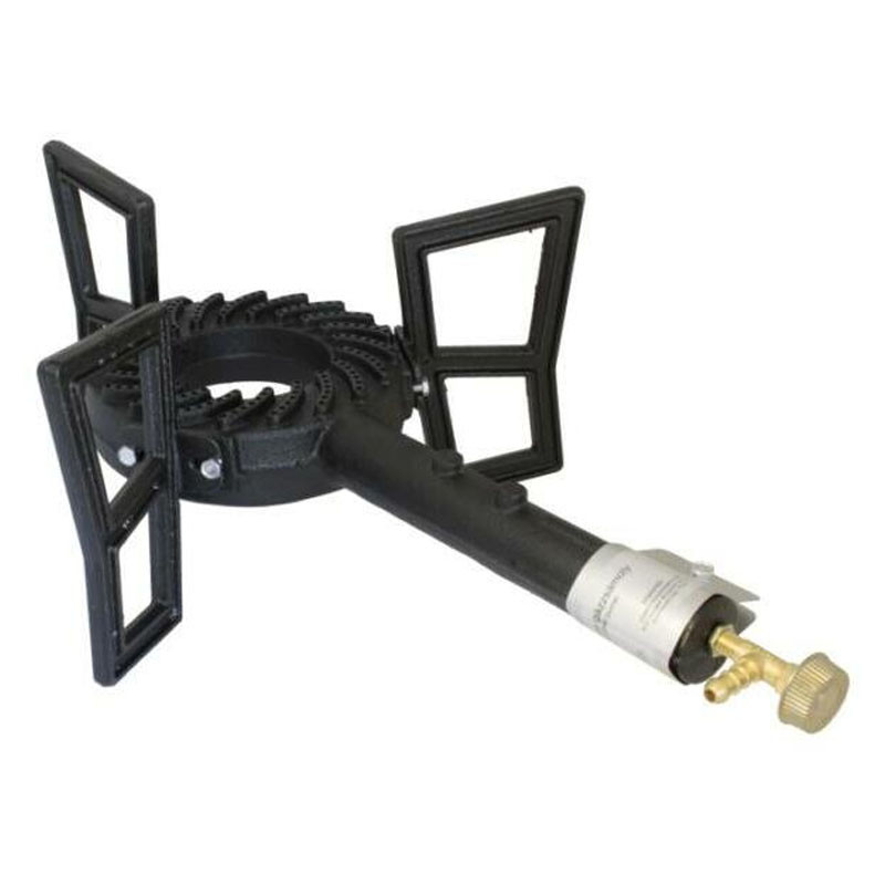 Öntvény gázzsámoly, öntöttvas test és tartólábak, fekete hőálló festéssel. Teljesítmény: 8kW. Gázrózsa átmérő 180 mm. Finommenetes láng szabályozó szelep.