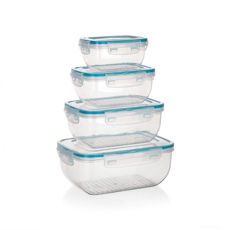 A BANQUET LEYA műanyag tárolódoboz készlet egy 4 darabos szett, amely türkiz szilikon tömítéssel rendelkezik, biztosítva a légmentes záródást. Ennek köszönhetően az élelmiszerek hosszabb ideig frissek maradnak.
