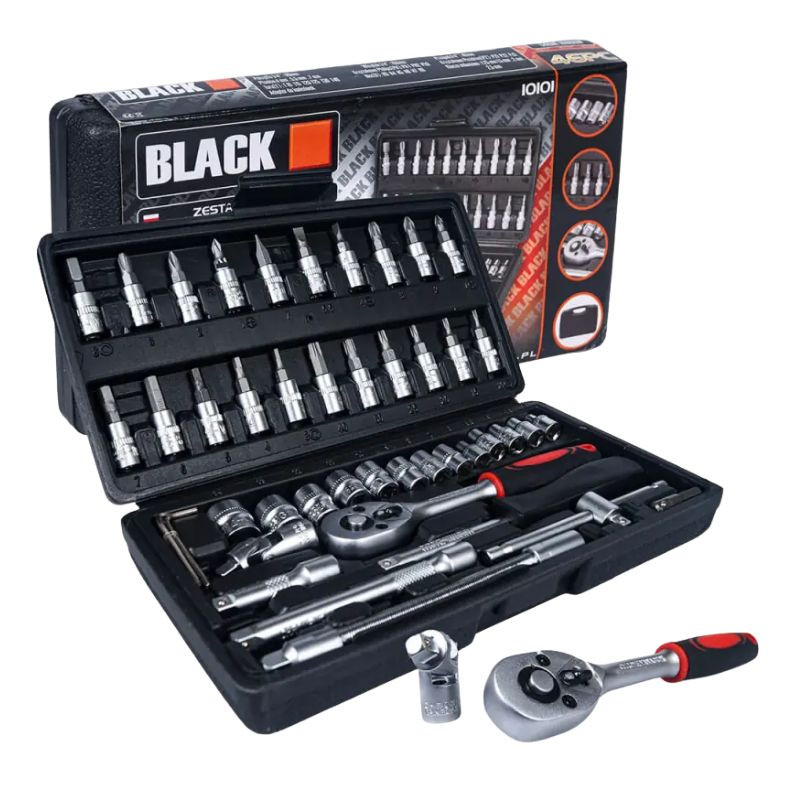 BLACK 46 db-os, 1/4 colos krova készlet egy sokoldalú és kompakt szerelőszerszám-készlet, amely ideális választás mind hobbi, mind kisebb professzionális felhasználásra. A strapabíró, króm-vanádium acélból készült elemek hosszú élettartamot biztosítanak, a mellékelt racsni, hosszabbítók és adapterek pedig számos csavarozási feladathoz alkalmazkodnak.