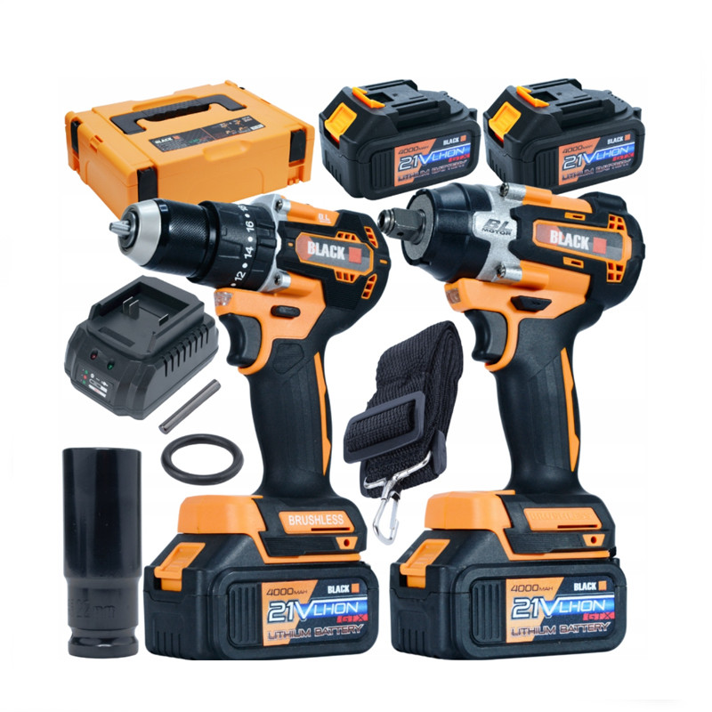 BLACK Mega akkus szerszámkészlet 21V 2×4Ah – 3in1 ütvefúrókalapács, sarokcsiszoló, ütvecsavarozó – 53745