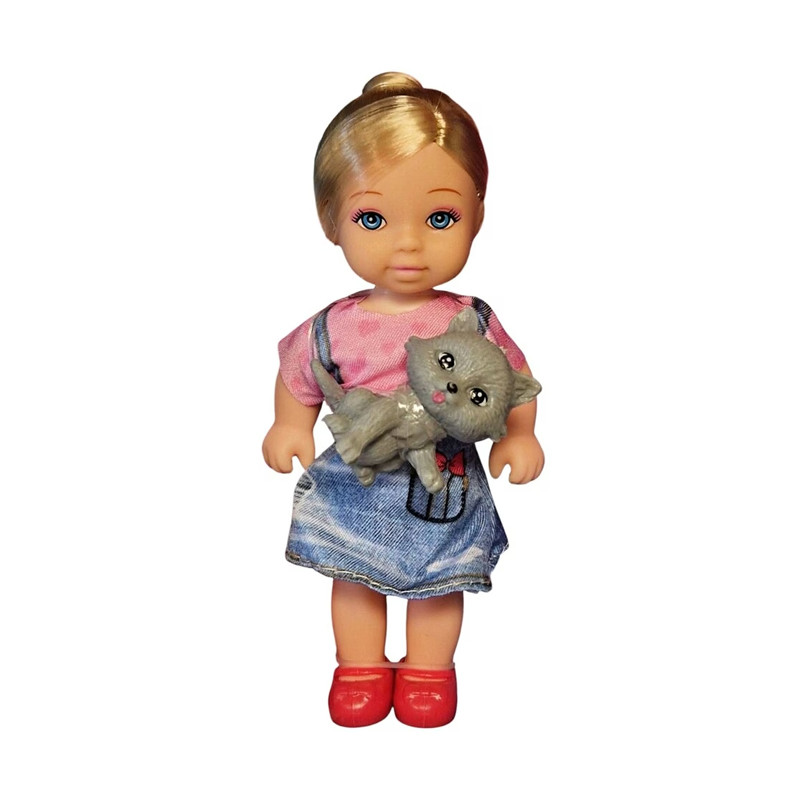 Ez a bájos 11,5 cm-es játékbaba ideális választás a szerepjátékot kedvelő gyermekek számára. A baba aranyos, részletgazdag öltözetet visel – farmermintás szoknyát és rózsaszín felsőt –, és egy elragadó kisállatot, egy kiscicát is tart a kezében, ami még színesebbé teszi a játékélményt.