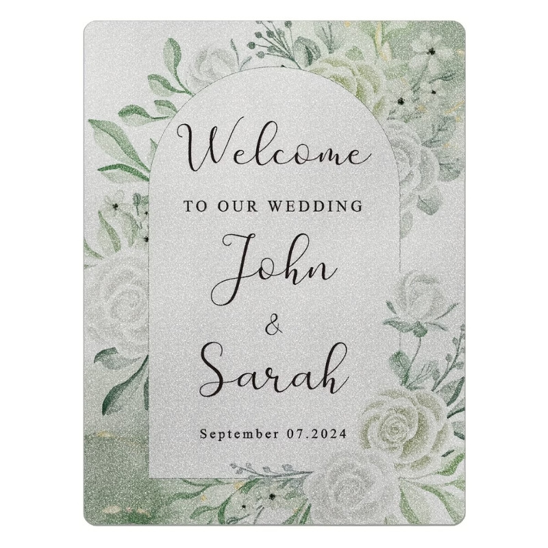 Ez a stílusos esküvői üdvözlőtábla tökéletes választás a nagy nap hangulatának megteremtéséhez. A finom virágmintás, elegáns design romantikus megjelenést kölcsönöz, így ideális bejárati dekorációként vagy fotózási kellékként is.