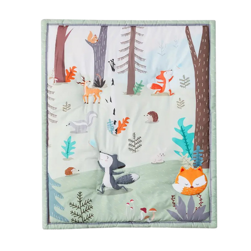 Ez a bájos erdei állatmintás baba takaró tökéletes választás kiságyba, babakocsiba vagy akár utazáshoz is. Egész évszakos kialakításának köszönhetően megfelelő meleget biztosít télen, miközben légáteresztő anyaga kellemes komfortot nyújt a melegebb hónapokban is. A szőtt poliészter huzat és poliészter szál töltet garantálja a tartósságot és a bőrbarát érzetet, így a takaró ideális újszülöttek és kisgyermekek számára is. Könnyen tisztítható, mosógépben mosható.