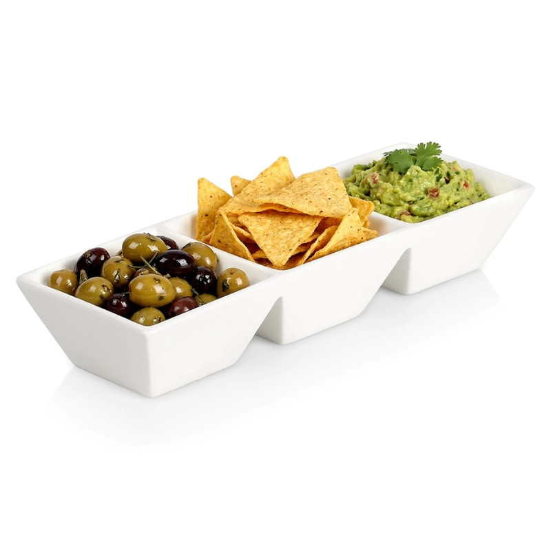 Ez a háromrészes fehér kerámia uzsonnástál ideális választás vendégváráshoz, filmestekhez vagy mindennapi nassoláshoz, amikor fontos a praktikus és rendezett tálalás.