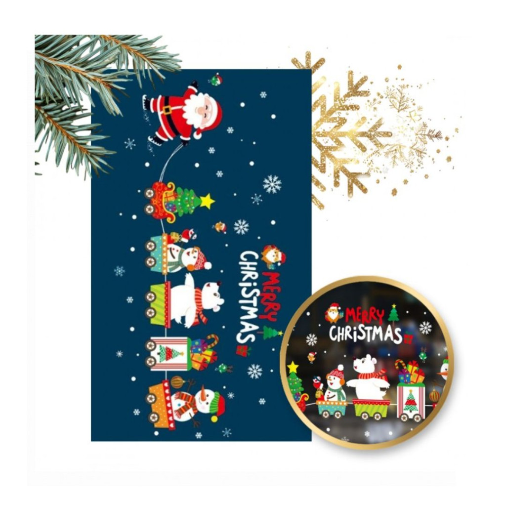 Vidám és hangulatos karácsonyi ablakmatrica, amely színes motívumaival feldobja az ünnepi dekorációt. A 30 × 45 cm-es lapon Mikulás, hóemberek, jegesmedve, karácsonyfa, ajándékok és hópelyhek láthatók, egy ünnepi vonatba rendezve. Könnyen felhelyezhető bármilyen üvegfelületre, nyom nélkül eltávolítható, és újra felhasználható, így több szezonon át használható.