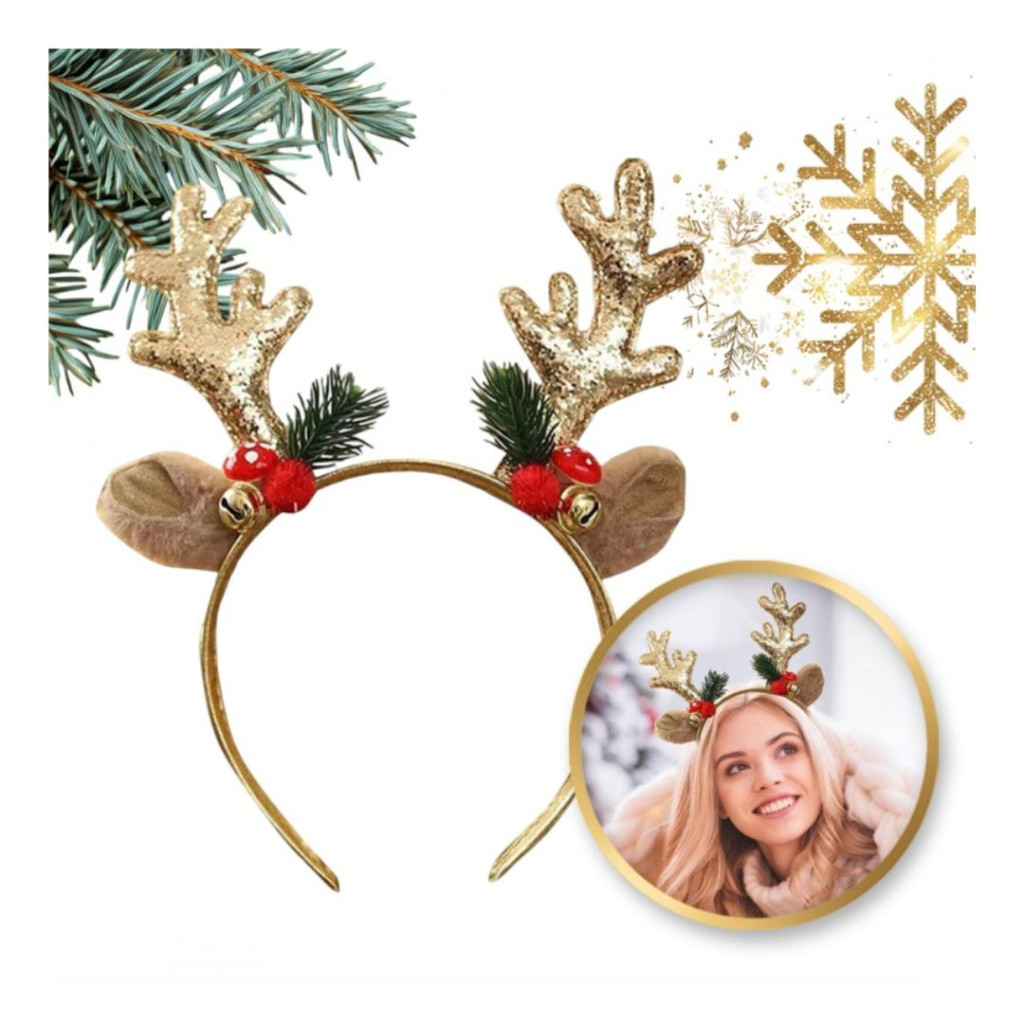 Vidám és ünnepi fejpánt, amely aranyszínű csillogó agancsokkal, zöld fenyődíszekkel, piros bogyókkal és kis csengőkkel teszi különlegessé a karácsonyi megjelenést. Tökéletes választás ünnepi bulikra, fotózásokra, családi összejövetelekre vagy ajándékként is.