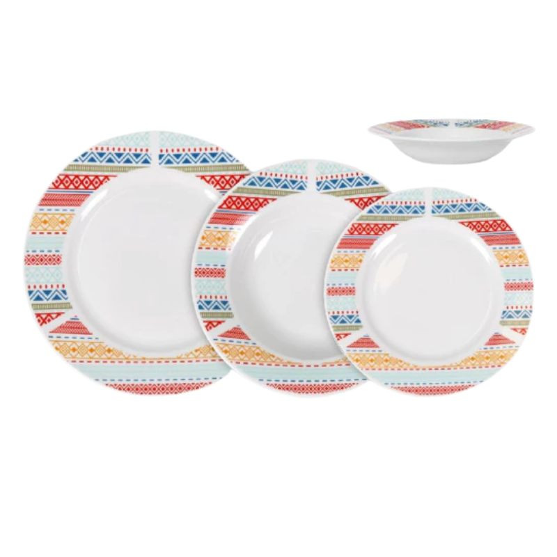 A La Mediterranea Palma 18 részes étkészlet a mediterrán életérzés legjavát hozza el az asztalodra. A fehér porcelán alapot élénk, geometrikus minták díszítik narancs-, kék-, piros- és sárga árnyalatokban, amelyek garantáltan feldobják a mindennapi étkezéseket.