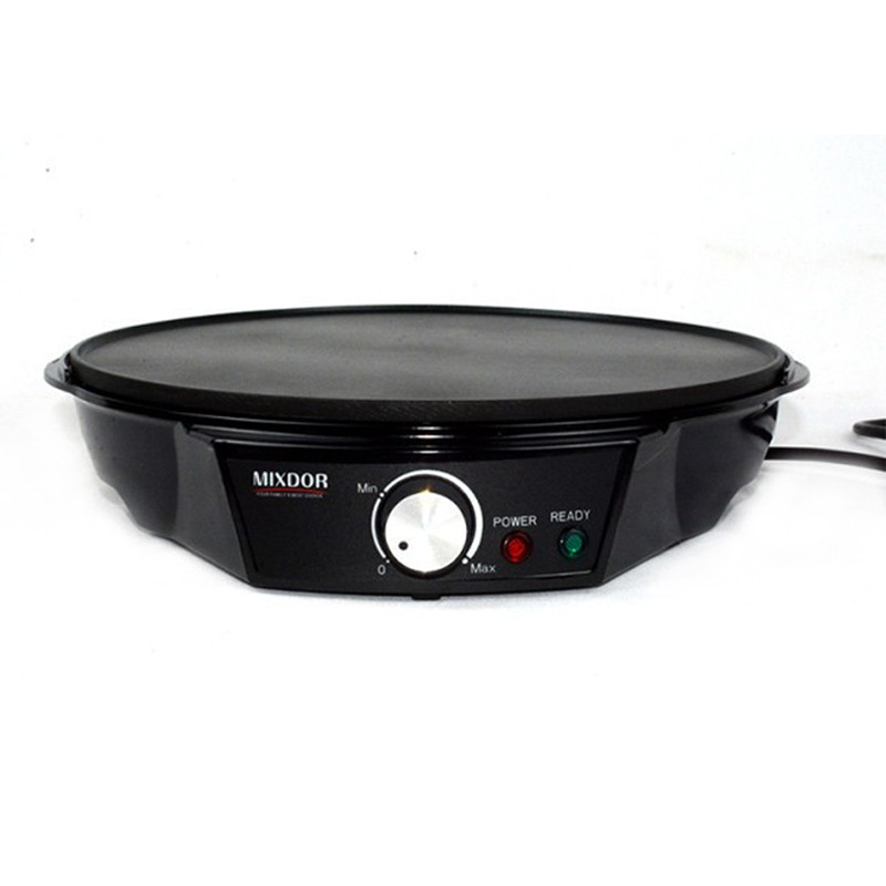 Mixdoor Palacsinta készítő - tapadásmentes sütőfelület, Szín: fekete, Sütőlap anyaga: teflon, Sütőlap átmérője: 30cm, Csúszásgátló lábak a biztonságos használathoz, Fokozatmentes állítható hőmérséklet szabályozás, Palacsinta forgató és T alakú simító, Feszültség: 220-240V 50-60 Hz, Teljesítmény: 1200W.Európai hálózati csatlakozós!