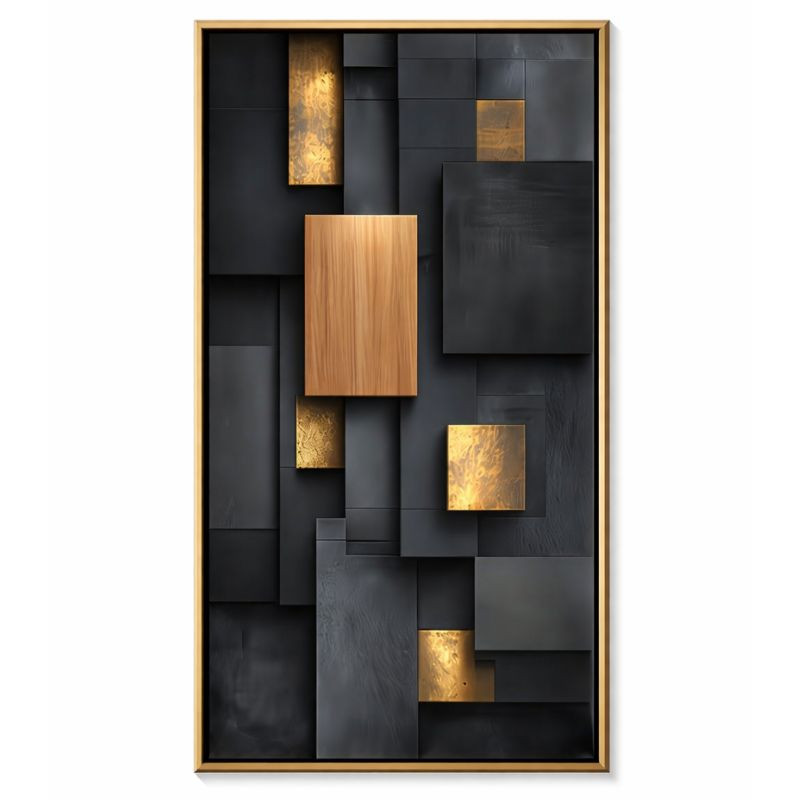 Elegáns és modern faldekoráció, amely különleges stílust ad otthonodnak vagy irodádnak. A geometrikus blokk mintázat fekete, sötétszürke és arany elemek kombinációjával készült, amely luxus hatást és mélységet kölcsönöz a képnek. A modern design tökéletesen illeszkedik minimalista, modern vagy ipari stílusú enteriőrökbe.