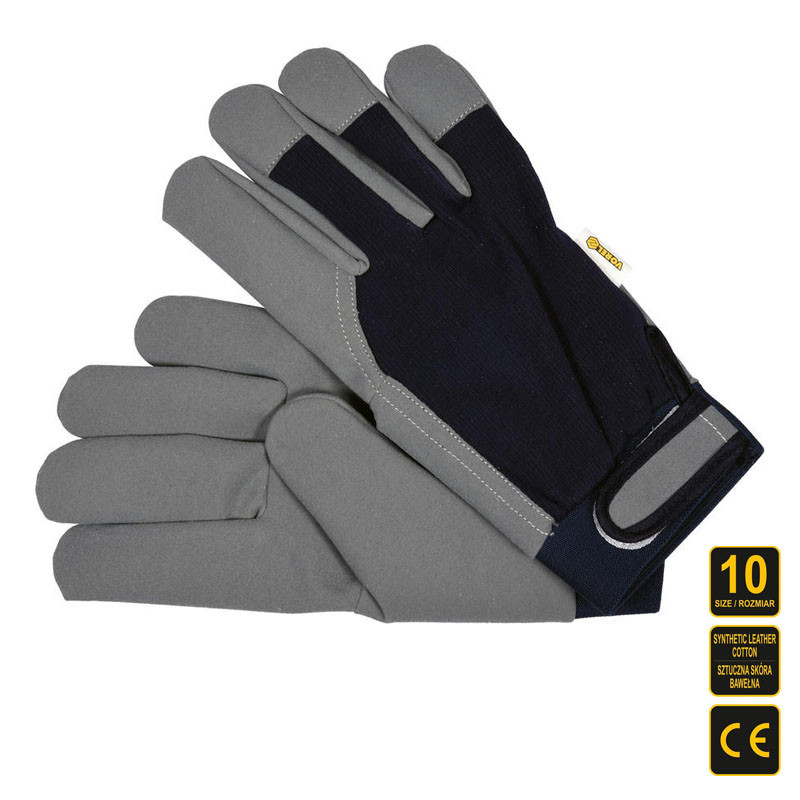 Könnyű, ötujjas védőkesztyű, amely kényelmet és biztonságot nyújt különféle munkavégzések során. Az elülső rész szintetikus Amar típusú anyagból készült szürke színben, amely kopásálló és tartós. A felső rész sötétkék pamutból, míg a mandzsetta tépőzáras gumis kialakítású, így a kesztyű jól illeszkedik a kézre, és stabil viseletet biztosít.
