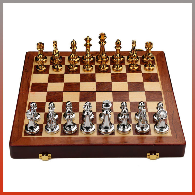 Sakkfigurák anyaga: belül fém, középen akril, kívül fémbevonat.