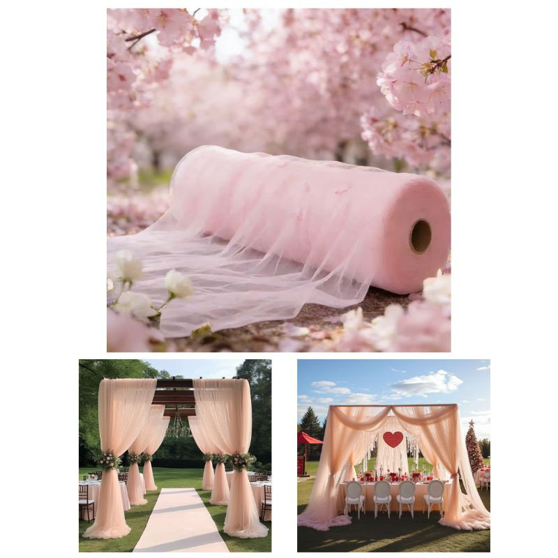 Lágy esésű, elegáns tüll anyag, amely tökéletes választás különleges alkalmak dekorációjához. A finom, világos rózsaszín árnyalat romantikus hangulatot teremt, így ideális esküvőkhöz, lánykérésekhez vagy ünnepi eseményekhez.