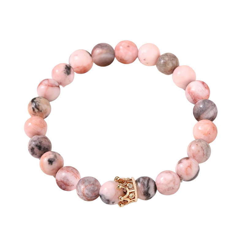 Ez az elegáns, rózsaszín árnyalatú kövekből készült karkötő különleges ajándék minden édesanya számára. A finoman csiszolt gyöngyök harmonikus színátmenete nőies és kifinomult megjelenést biztosít, míg a középen elhelyezett arany színű korona dísz a szeretet és megbecsülés jelképe.