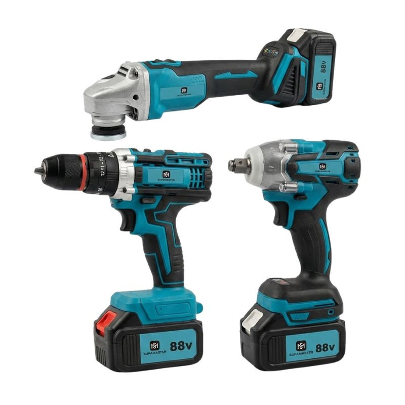 Komplett 88V-os akkumulátoros szerszámcsomag nagy teljesítménnyel, amely tartalmaz egy ütvecsavarozót, egy sarokcsiszolót és egy fúró-csavarozót, így minden ház körüli munkához ideális választás.