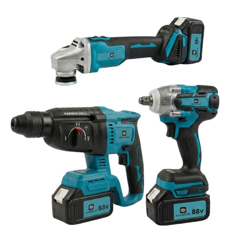 Nagy teljesítményű, 88V-os akkumulátoros szerszámcsomag nehéz feladatokhoz. A készlet tartalmaz egy ütvecsavarozót, egy sarokcsiszolót és egy erős fúrókalapácsot, így betonfúráshoz és bontáshoz is ideális.