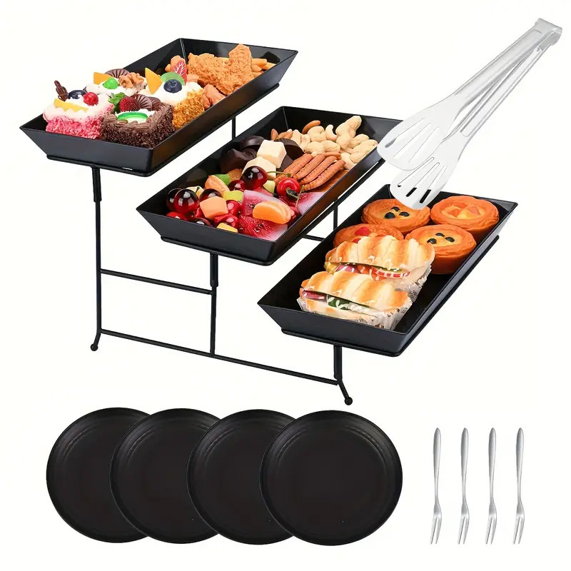 Ez a modern, többszintes tálalókészlet tökéletes választás ünnepi alkalmakra, családi összejövetelekre vagy elegáns svédasztalos kínáláshoz. A 3 szintes fémállvány stabil tartást biztosít a tálcáknak, melyeken ízlésesen elrendezhetők sós és édes falatok, gyümölcsök, sütemények vagy előételek.
