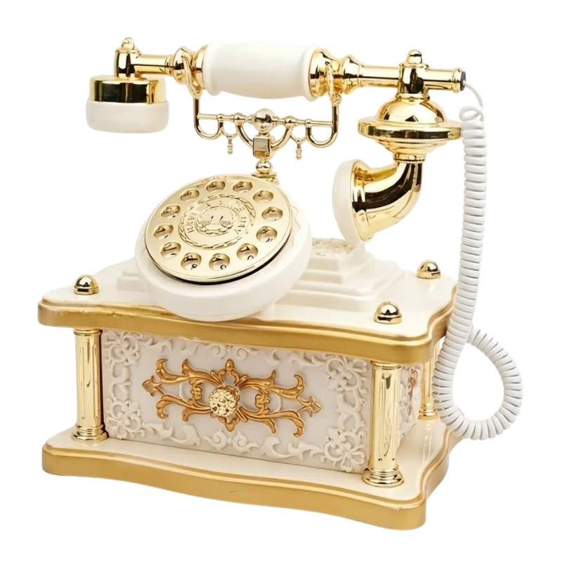 Ez a különleges, retro stílusú zenedoboz egy klasszikus forgótelefon formáját idézi, elegáns arany fehér színvilággal. Részletgazdag kidolgozása és díszített kialakítása igazán látványos dekorációvá teszi otthon vagy irodában.