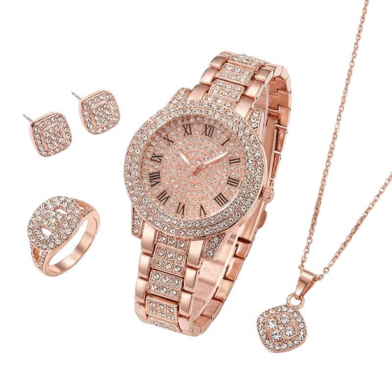 5 Részes Luxus Női Karóra és Ékszer Szett Strasszkövekkel - Rózsaarany Színben VJ9749671-RG