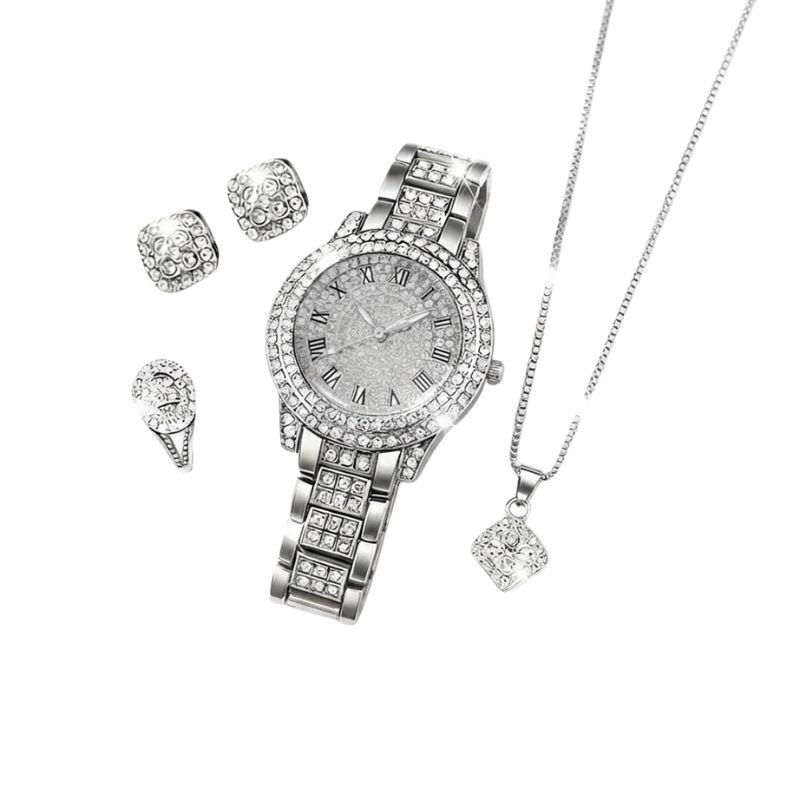 5 Részes Luxus Női Karóra és Ékszer Szett Strasszkövekkel - Ezüst Színben VJ9749671-S