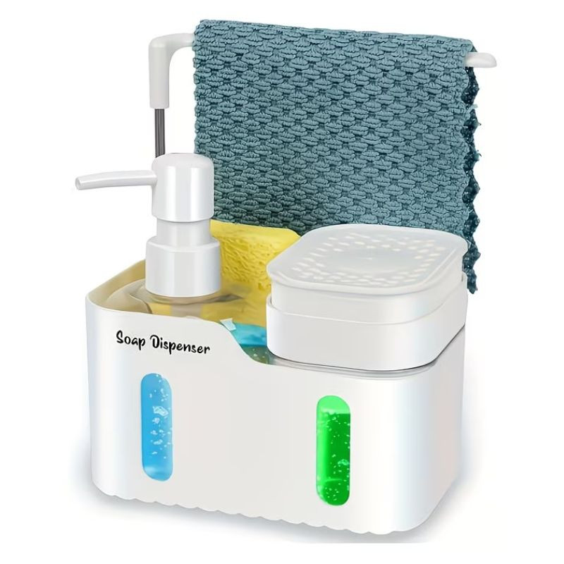 Az adagolóhoz tartozó tartórekeszben elhelyezhető a szivacs vagy mosogatókefe, míg a felső rúdra konyhai törlőkendő akasztható. A modern kialakítás és a praktikus tárolórekeszek segítenek rendben tartani a mosogató környékét.